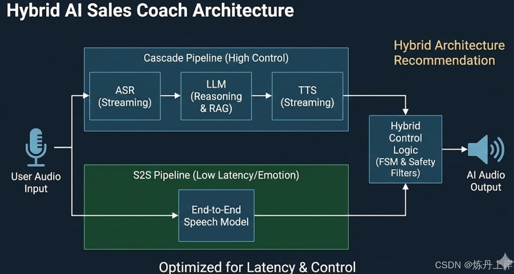 针对 AI 销售陪练场景,建议采用 混合架构(Hybrid Architecture):保留级联架构处理核心逻辑,在语音层引入流式优化,并在非关键环节引入 S2S 增强情感。