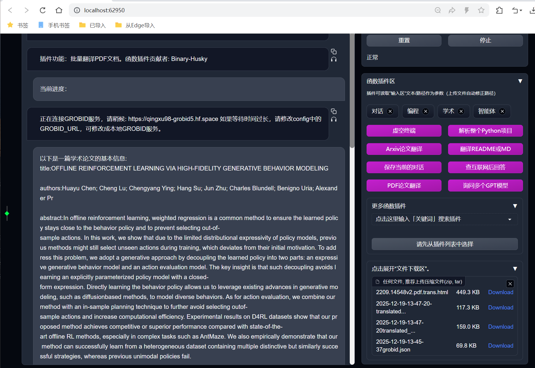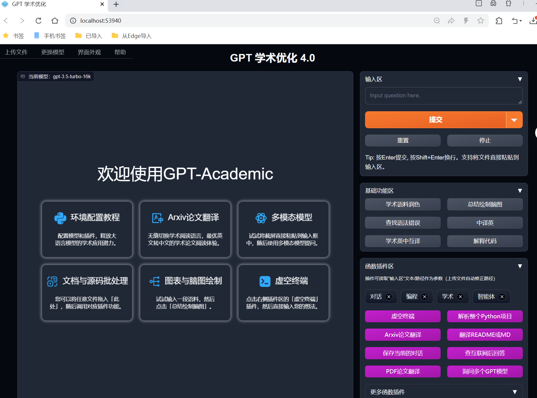 - 函数插件区:分类展示扩展功能,如 "Arxiv 论文翻译""PDF 全文总结""谷歌学术检索""多模型并行问询" 等,按需选择即可;