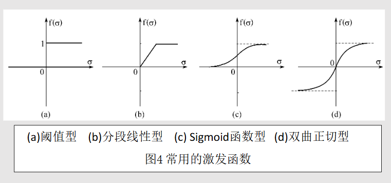 式中,x为第i个元素的输入,w为第i个处理单元与本处理单元的互联权值。f称为激发函数,决定了节点的输出。一般激发函数是非线性的,常用的非线性激发函数为: