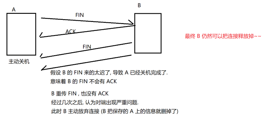 网络传输中,随时会出现丢包问题,三次握手四次挥手也不例外。丢包就需要出发超时重传机制,三次握手的过程中超时重传可以很好的解决这个问题。在四次挥手中,FIN和第一个ACK丢了也可以使用超时重传解决,但有一个特殊的情况:如果最后一个ACK(A->B)丢了,如果此时没有TIME_WAIT这个状态,而是A直接断开连接,后面B收不到ACK重传FIN时就无人处理了。所以此时A收到FIN后,不会立即释放连接,而是等待对方以防重传FIN,这个等待时间会很长,能确认对方确实不会重传FIN时再释放~~这个时间通常为2 倍 MSL(报文最大生存时间),MSL 是报文在网络中的最大存活时长(一般为 1-2 分钟),确保对方的重传 FIN 能被 A 接收。
