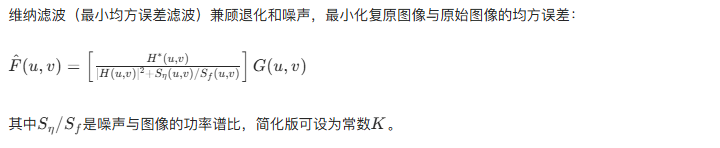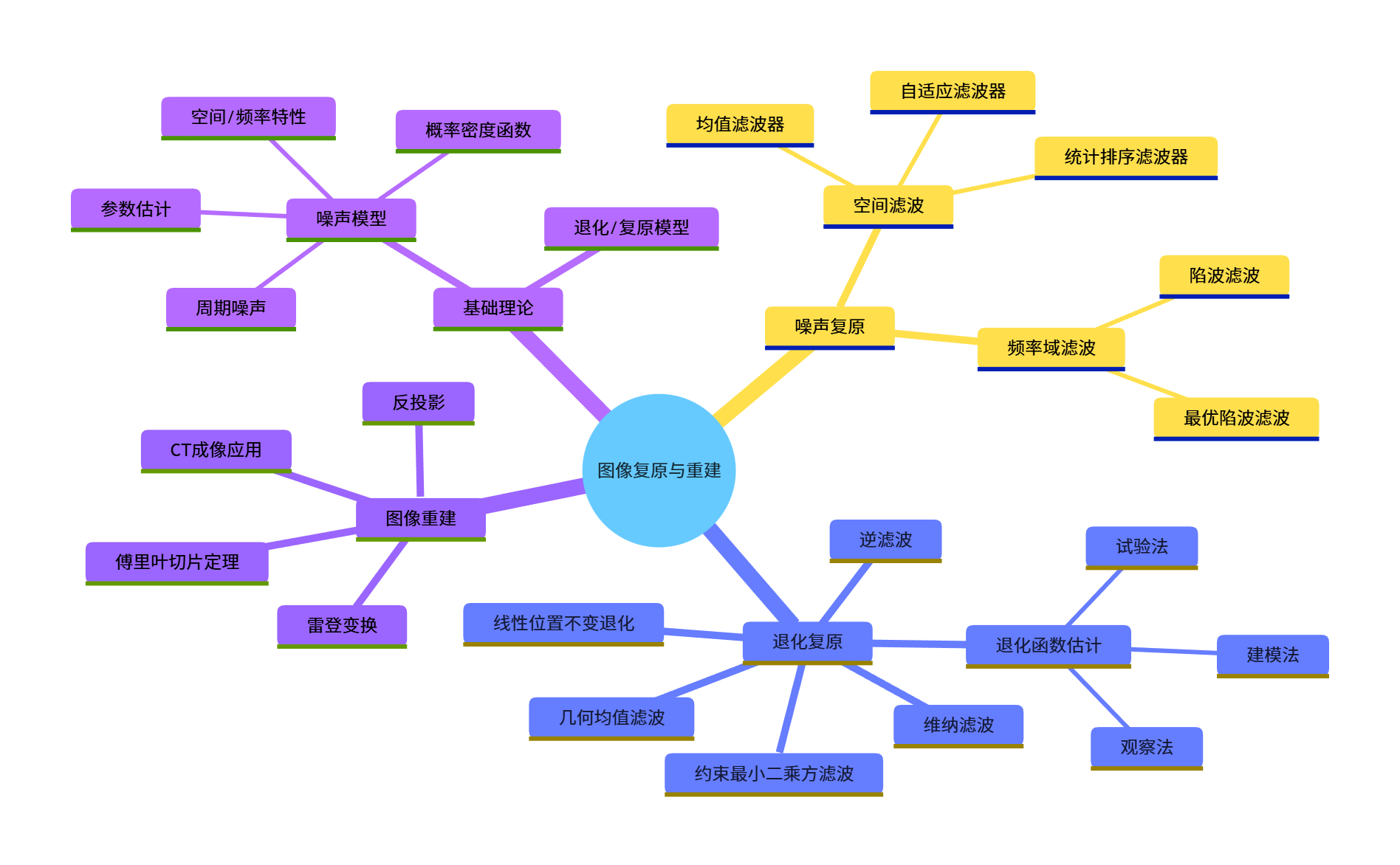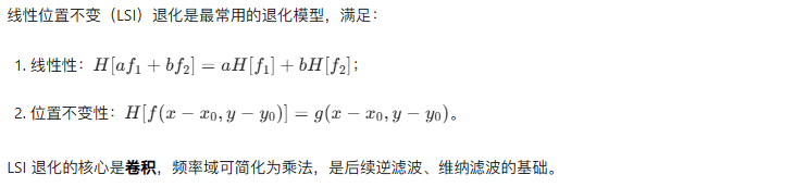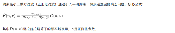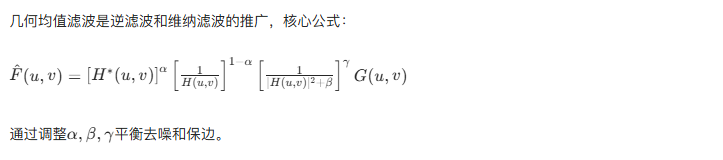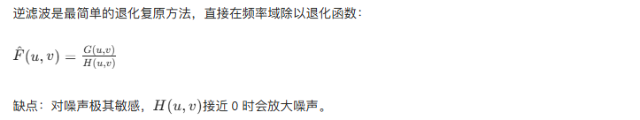 - 图像复原的核心是建立退化模型,通过逆过程 + 噪声抑制恢复图像;