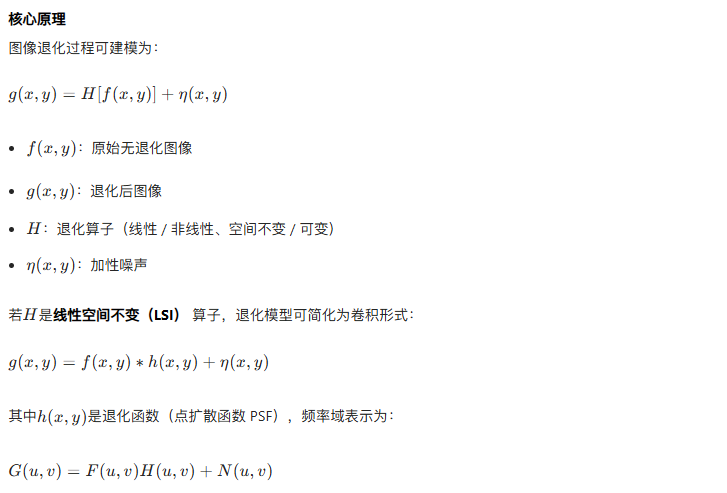 - 理解图像退化 / 复原的数学模型,掌握核心变量关系;