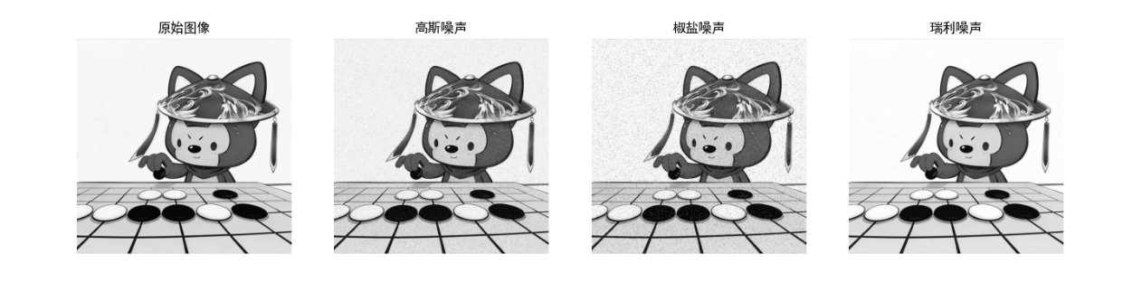 运行上述代码后,将显示「原始图像 + 高斯噪声 + 椒盐噪声 + 瑞利噪声」的 4 列对比图,直观看到不同噪声的视觉特征。