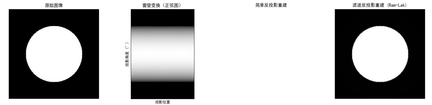 运行代码后显示 4 张子图:原始圆形图像→雷登变换正弦图→简单反投影重建(模糊)→滤波反投影重建(清晰),直观展示 CT 重建的核心过程。