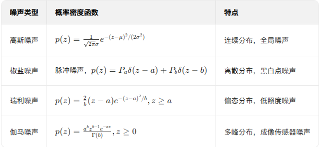 - 频率特性:噪声的频谱分布(如周期噪声是频率域的离散峰值,高斯噪声是全频率分布)。