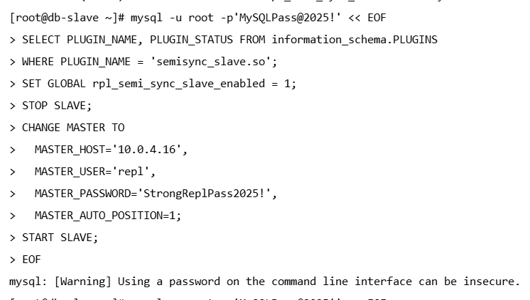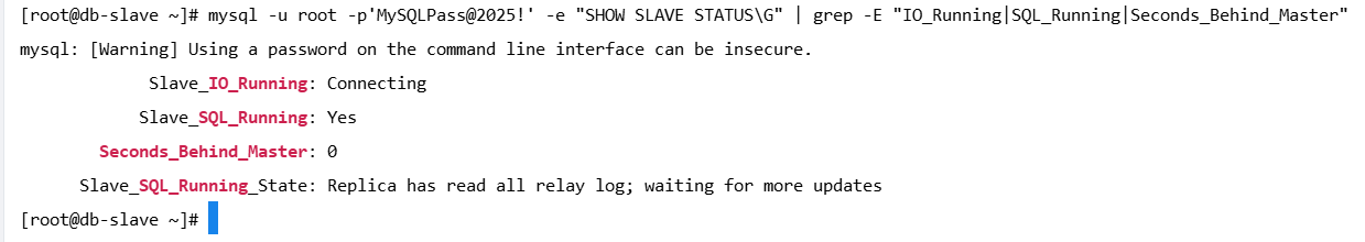mysql -u root -p'MySQLPass@2025!' -e "SHOW SLAVE STATUS\G" | grep -E "IO_Running|SQL_Running|Seconds_Behind_Master"