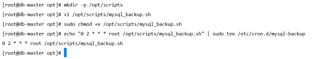 echo "0 2 * * * root /opt/scripts/mysql_backup.sh" | sudo tee /etc/cron.d/mysql-backup