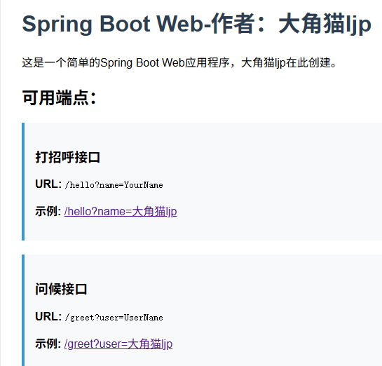 <p><strong>示例:</strong> <a href="/hello?name=大角猫ljp" target="_blank">/hello?name=大角猫ljp</a></p>