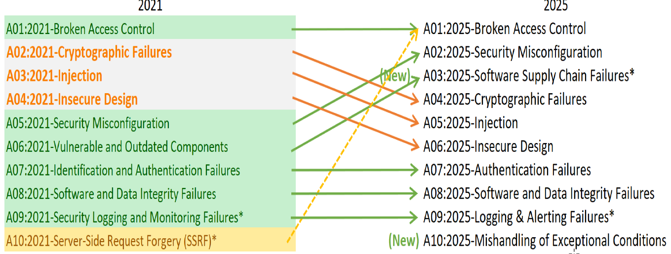 - 名称与序号调整:部分漏洞名称优化以更贴合实际威胁场景,如"Identification and Authentication Failures"简化为"Authentication Failures","Security Logging and Monitoring Failures"调整为"Logging & Alerting Failures";序号调整反映优先级变化,例如"Security Misconfiguration"从第5位升至第2位,"Cryptographic Failures""Injection""Insecure Design"均下降两位。