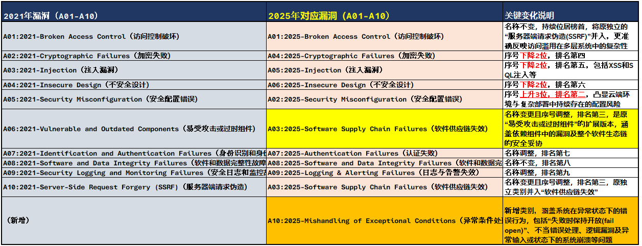 以下是2021年与2025年OWASP Top 10安全漏洞的中文详细对比表格