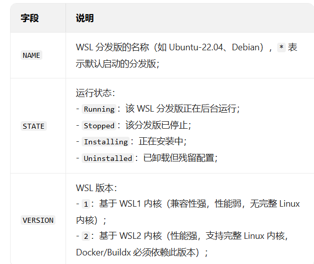 列出当前 Windows 系统中已安装的所有 WSL 分发版,并显示每个分发版的详细状态信息,是排查 WSL 环境、确认架构 / 运行状态的关键指令。