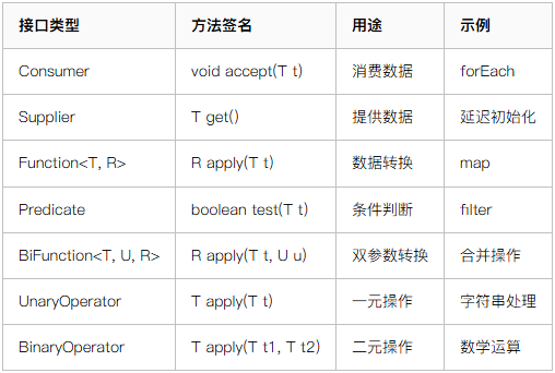 在四大核心函数式函数式接口的基础上,还有BiFunction<T, U, R> - 双参数转换、UnaryOperator<T> - 一元操作、BinaryOperator<T> - 二元操作。简单来说,UnaryOperator和BinaryOperator并非新的概念,而是两大核心函数式接口的"特化"或"简化版"。它们与四大核心函数接口的关系是包含与被包含的关系,而非并列关系。