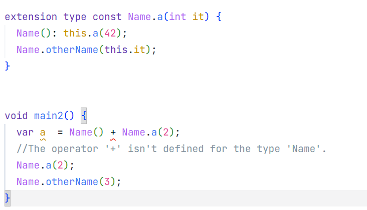 表示声明本身就是一个隐式构造函数,因此它默认替代了扩展类型的未命名构造函数。任何额外的非重定向生成构造函数都必须在初始化列表或形式参数中使用 this.i 来初始化表示对象的实例变量。