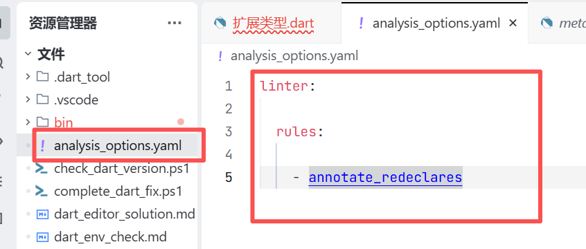 您还可以启用 annotate_redeclares 代码检查规则。这样一来,如果您声明的扩展类型方法隐藏了超接口成员且未使用 @redeclare 注解,就会收到警告。