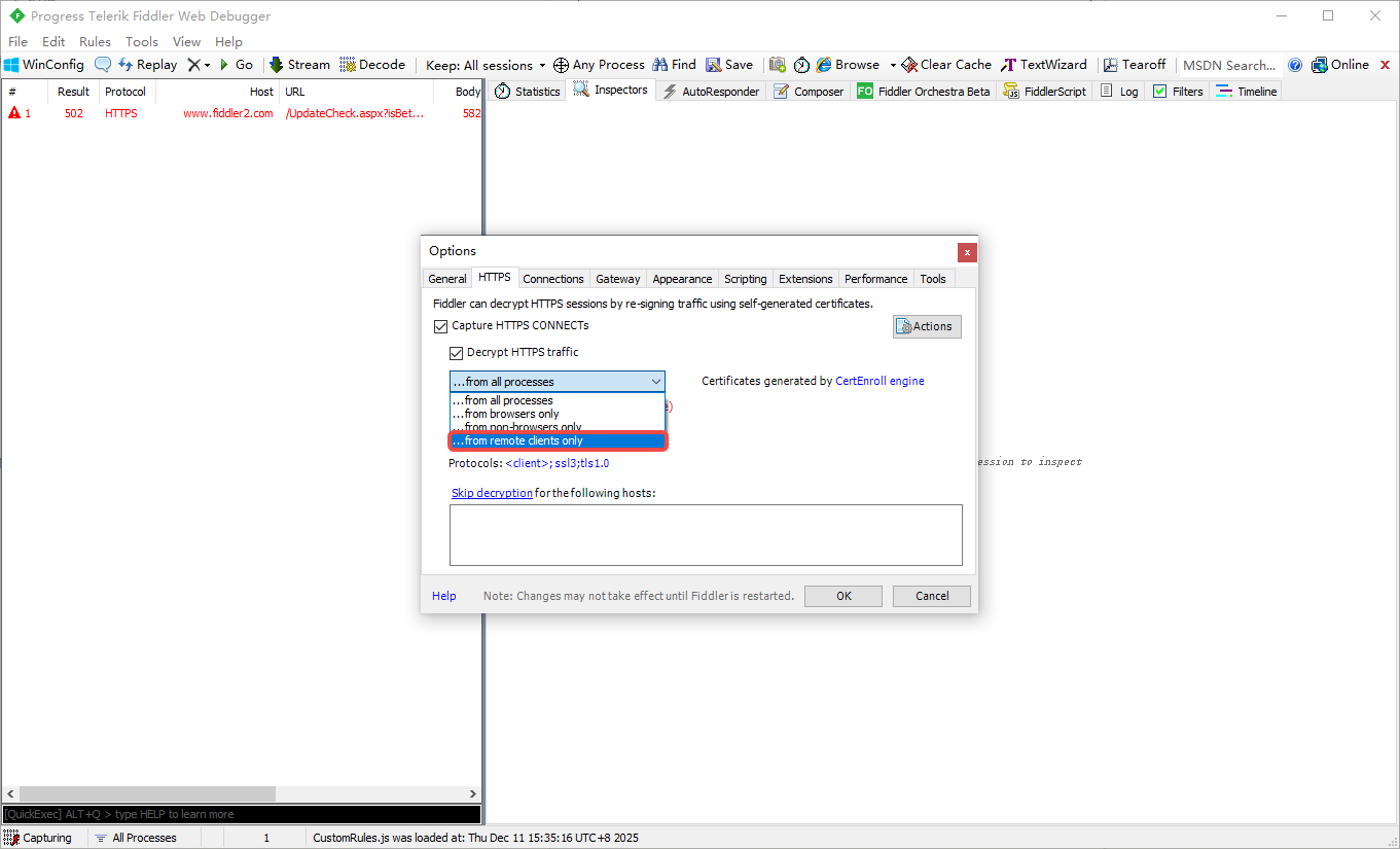 - 打开Fiddler --- Tools --- Options --- HTTPS --- 下拉列表选择 from remote clients only
