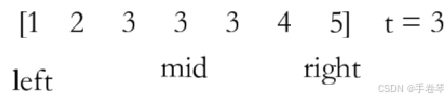 当mid直接指向目标值时,要想判断mid指向的是起始值还是结束值又或者中间值,还需要将mid向前和向后遍历查看所在位置,此时效率和暴力查找一样(将上述数组全换为3)