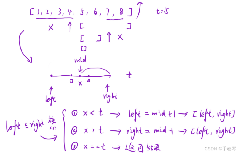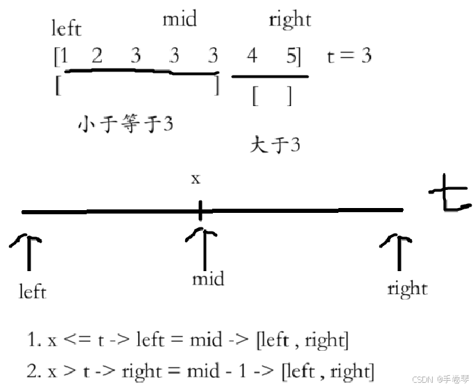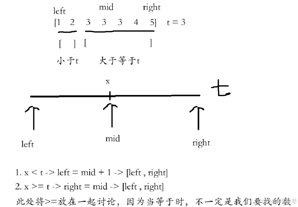 2.求mid尽量不要这样写:mid = (left + right) / 2; 而是mid = left + (right - left) / 2; 或者mid = (left + right + 1) / 2;或者mid = left + (right - left + 1) / 2; 可以防止溢出