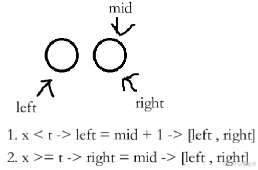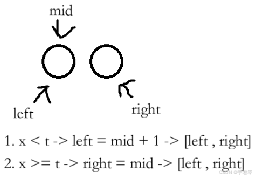 在朴素二分中,防止溢出有:mid = left + (right - left) / 2; (命中左端点)或者mid = left + (right - left + 1) / 2;(命中右端点) 两种操作。