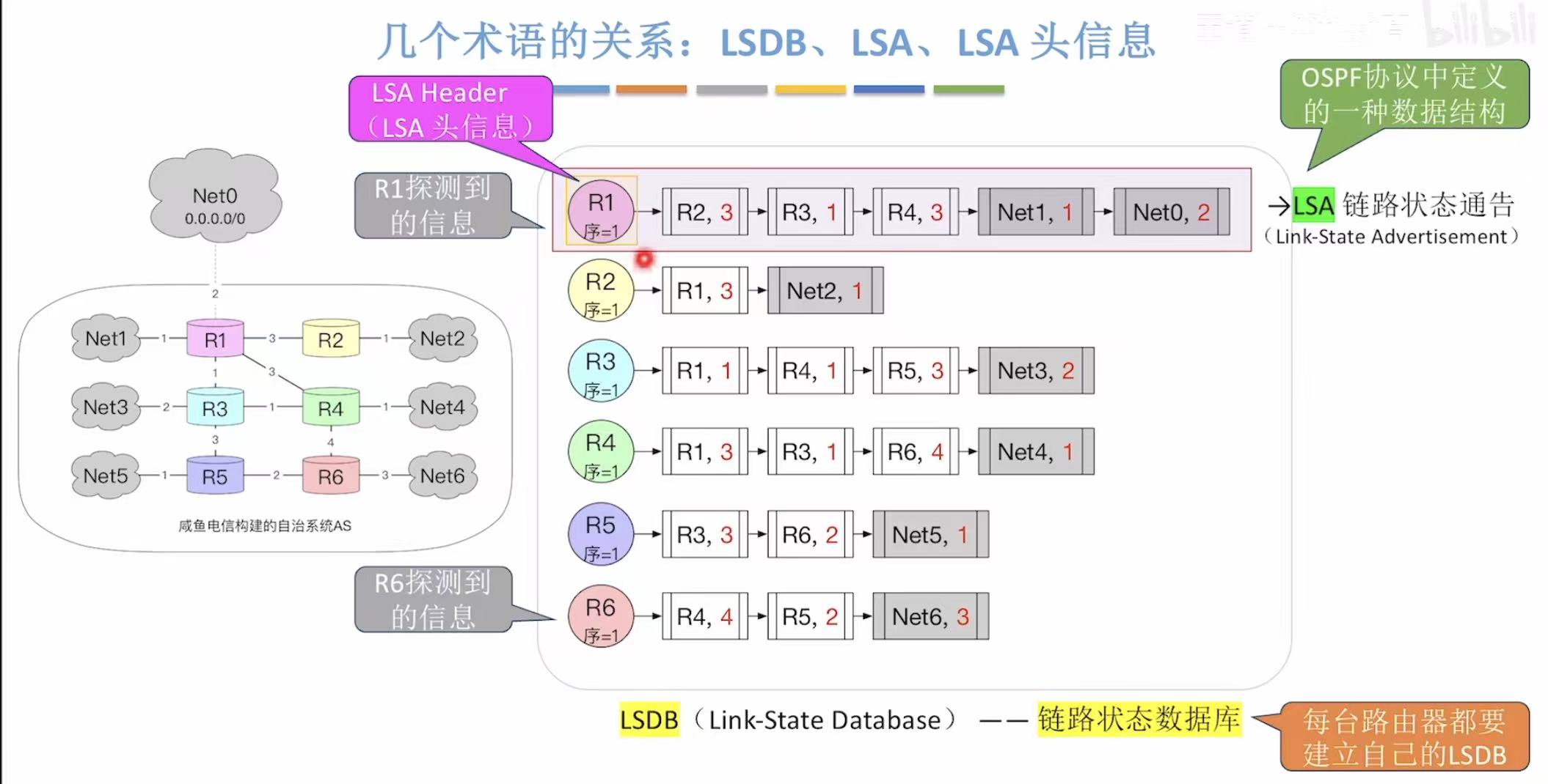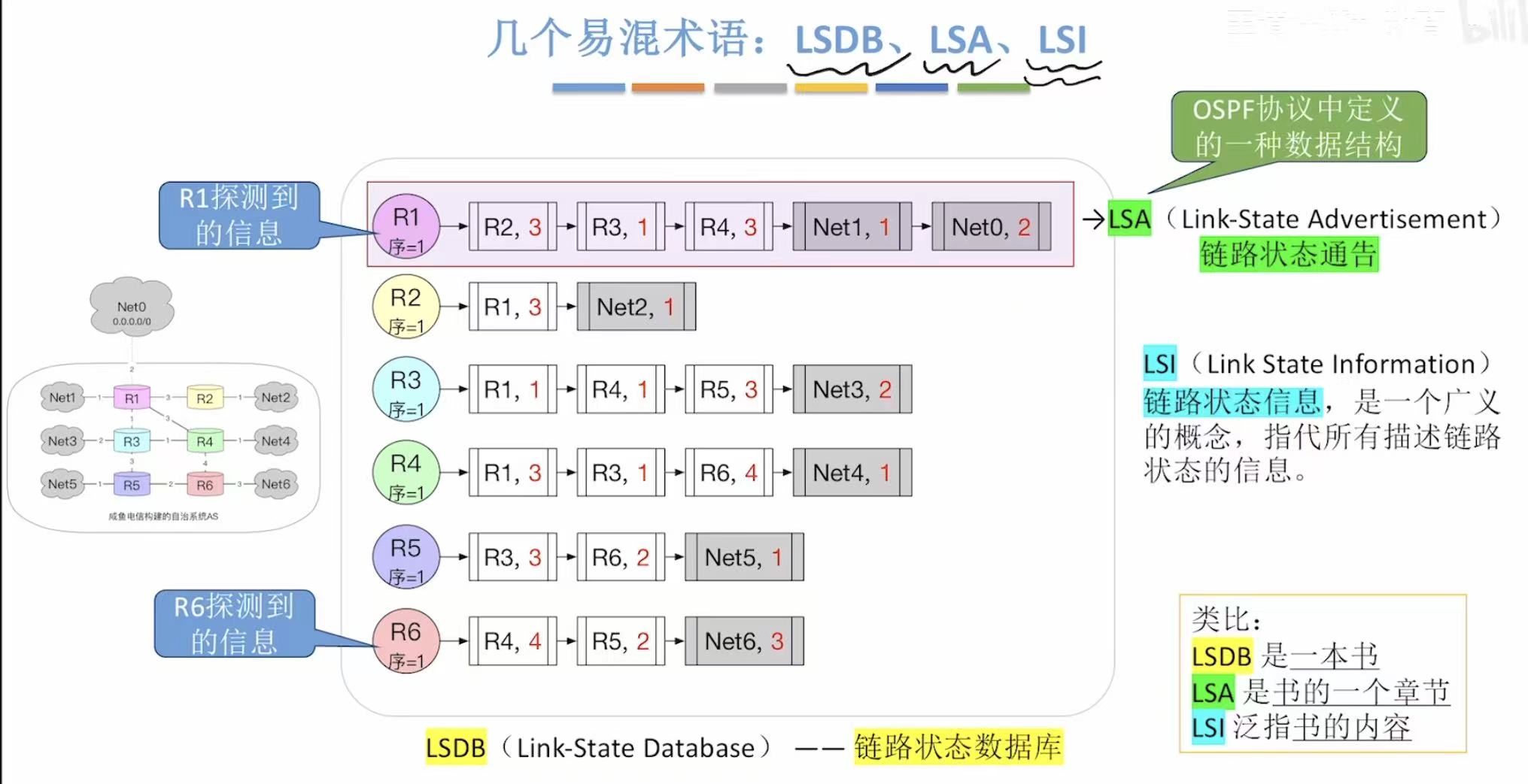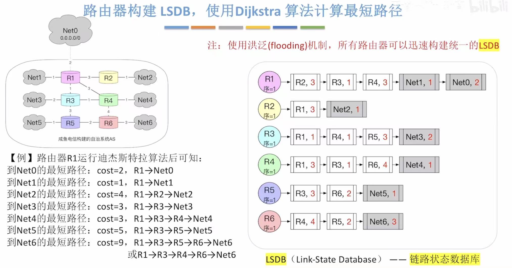 直接探测信息-->LSDB-->迪杰斯特拉-->获得最短路径