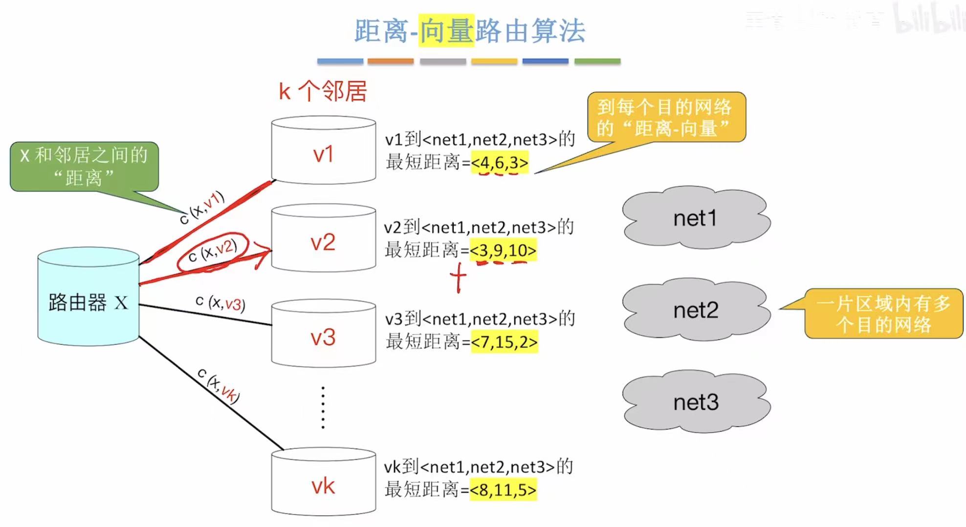 因为一片区域中有很多个网络,路由器到某个具体的网络的距离可以统一放在一起就组成了向量 (如图黄色的位置)