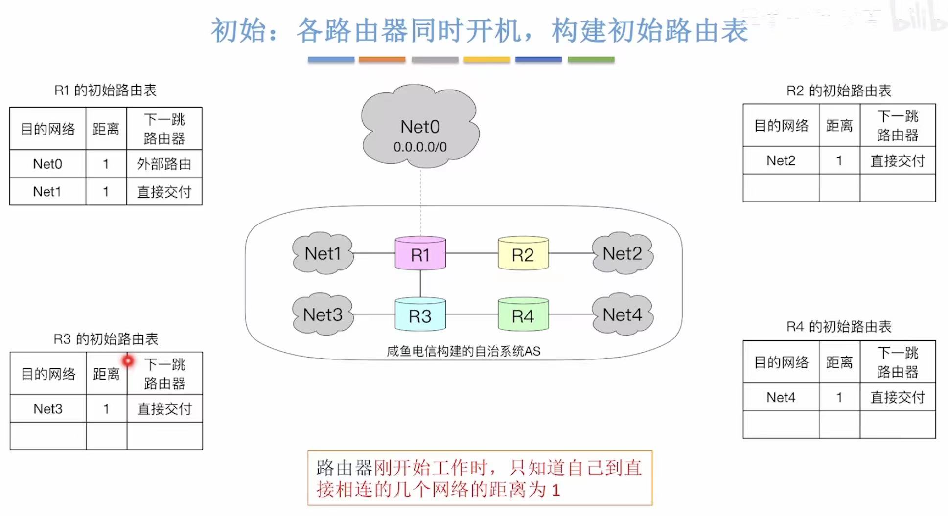 刚开机,每个路由器都只知道和自己直接相连(距离为1)的网络