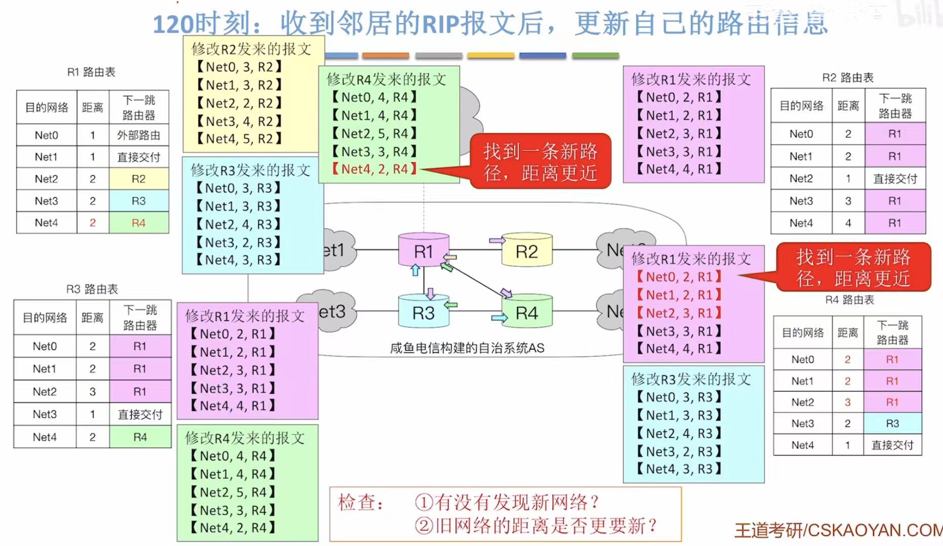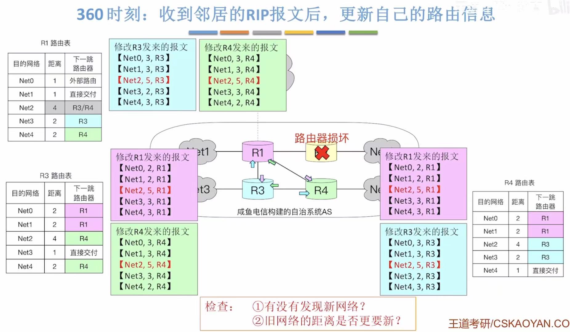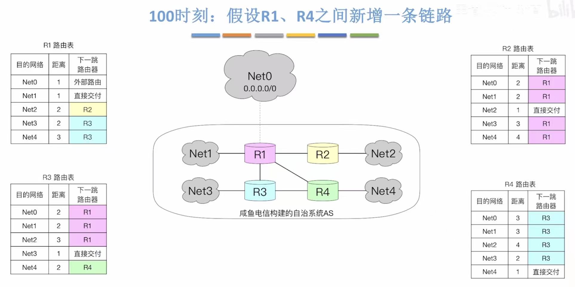 之前我们说到RIP只看最短距离,R1和R4中间的路通了,R4找R2自然也就有了更短的距离,所以马不停蹄把R3给优化掉了