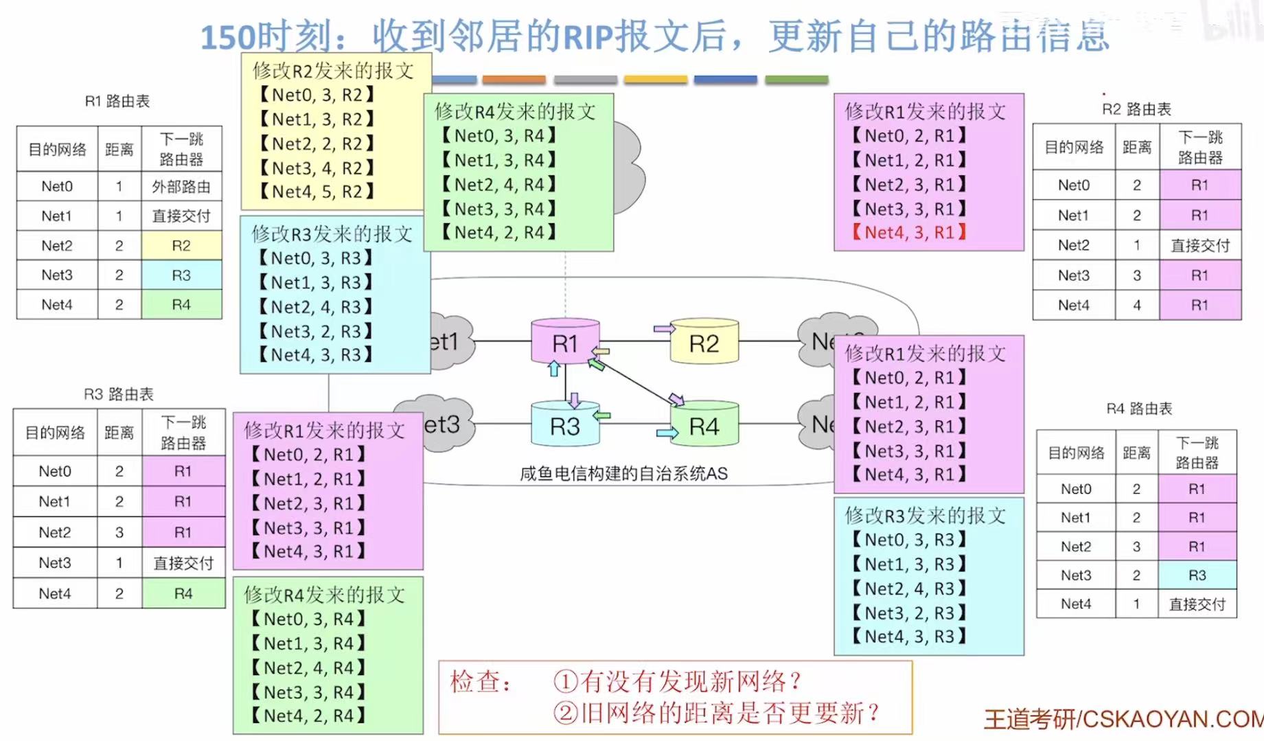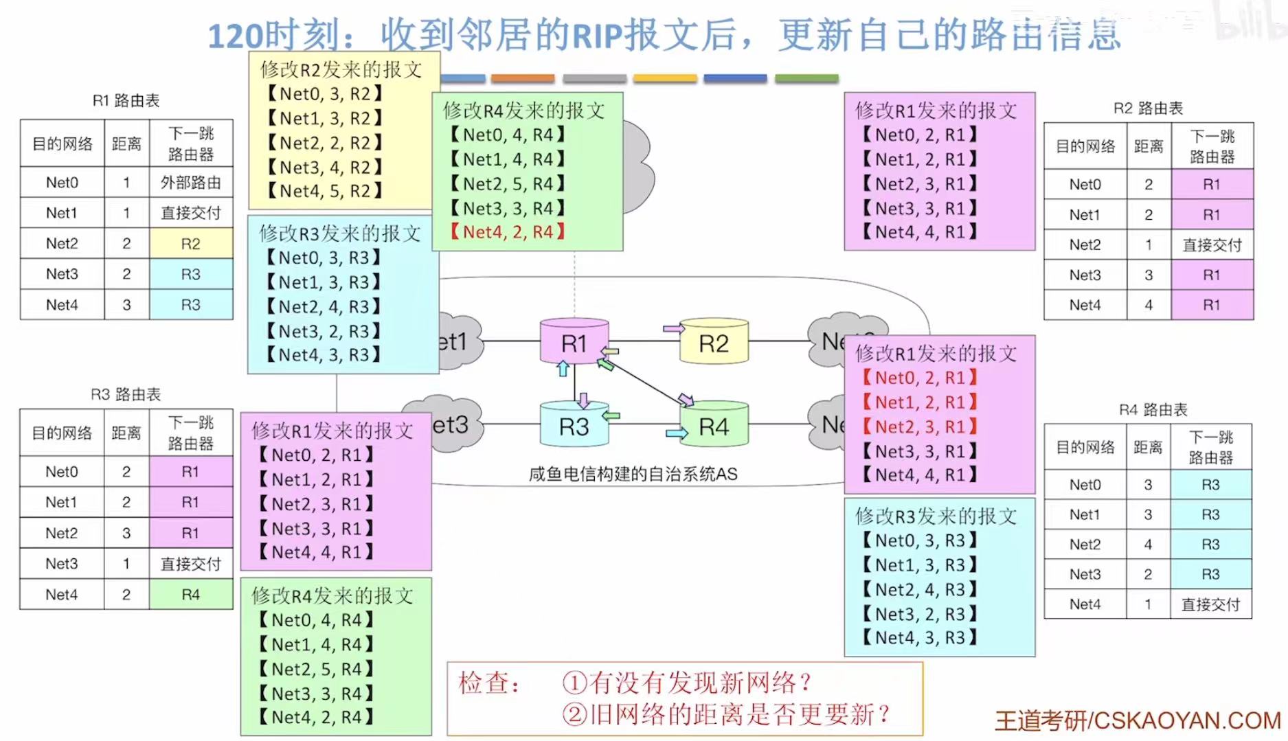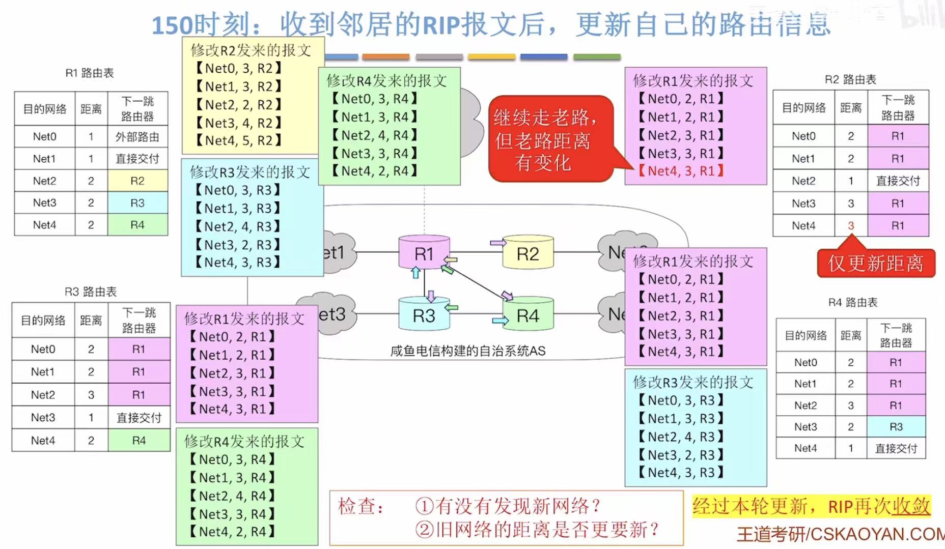 之前我们说到RIP只看最短距离,R1和R4中间的路通了,R4找R2自然也就有了更短的距离,所以马不停蹄把R3给优化掉了