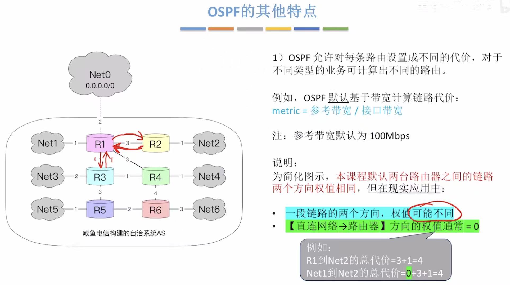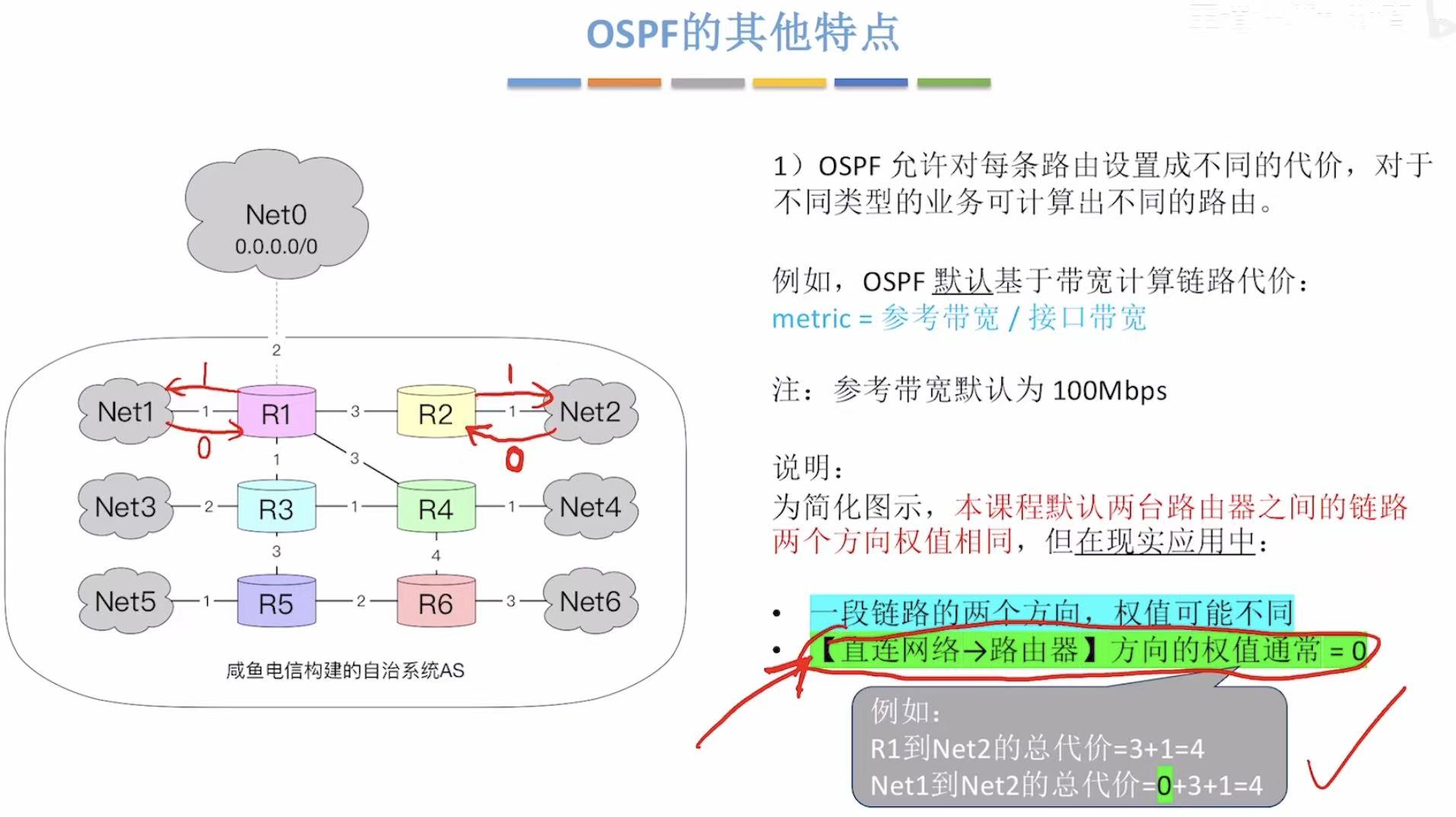 R1-->直链网络可以有链路代价,但是直连网络-->R1是无代价的。