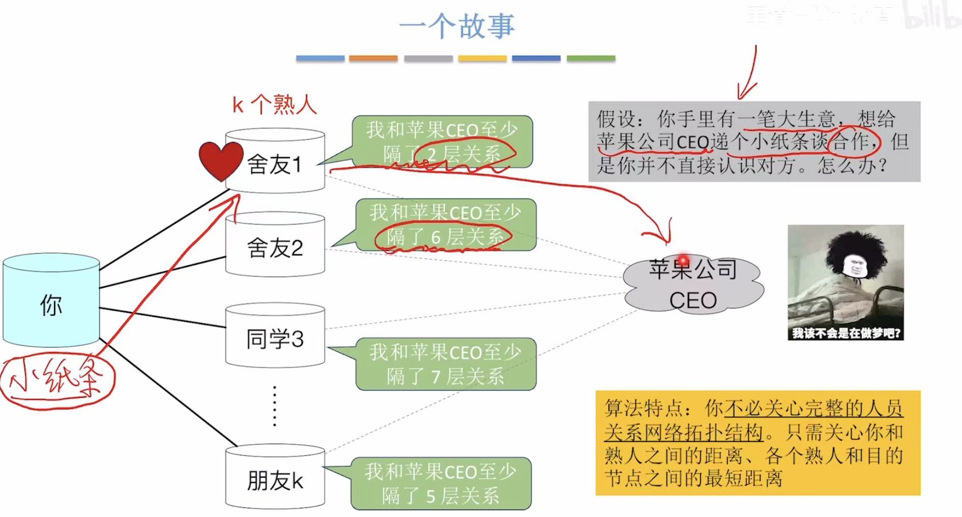上面例子中最短的距离是:你和舍友的距离+舍友和苹果CEO的距离