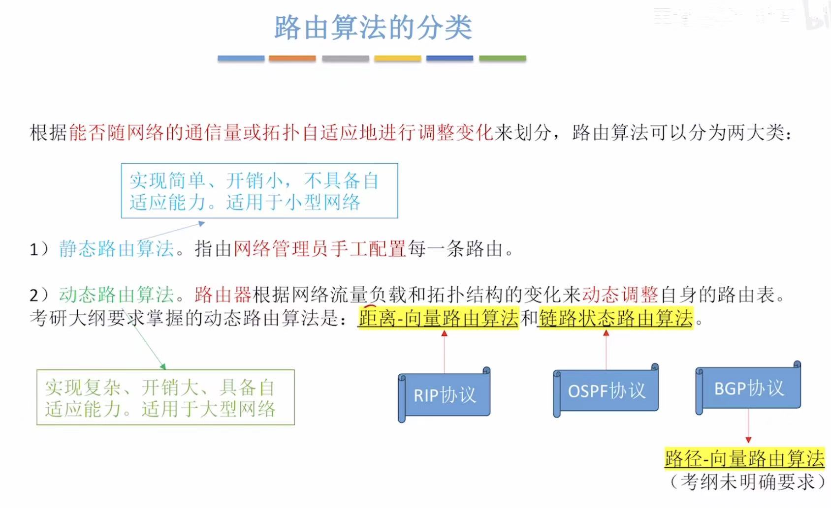 - 动态分为:距离-向量路由算法(用于RIP协议)、链路状态路由算法(用于OSPF协议)