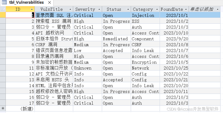 VulnTitle TEXT(100) NOT NULL, -- 漏洞名称