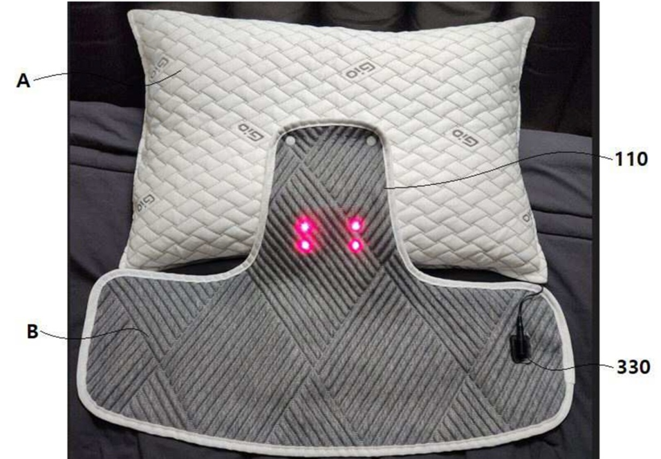 先来说说这个近红外线照射模块,它可真是个厉害的角色。这个模块内部配备了多个近红外线照射光源,当它与枕头本体结合后,就开始发挥神奇功效。模块分为两个区域,一个是对应人体颈部位置的颈椎区域部,另一个是连接在颈椎区域部下方、比颈椎区域部更宽的肩部区域部,形状有点像带翅膀的结构。