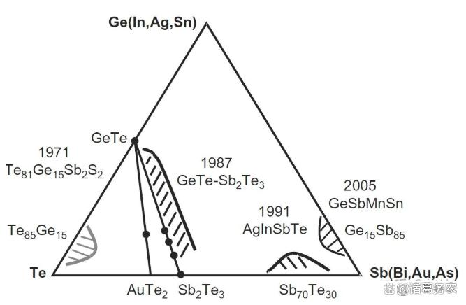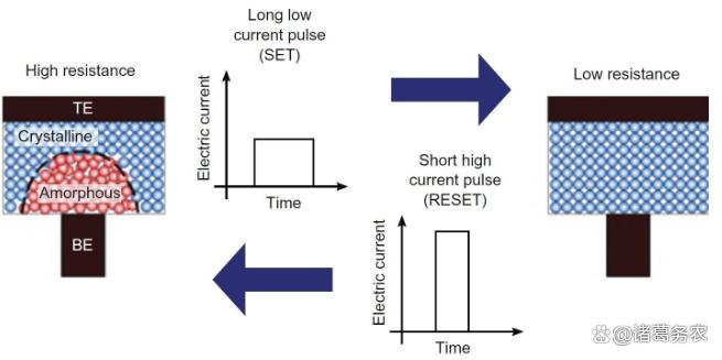 相变材料(PCM):如 Ge₂Sb₂Te₅ (GST)。通过晶态(低阻)与非晶态(高阻)的相变来实现电阻切换。
