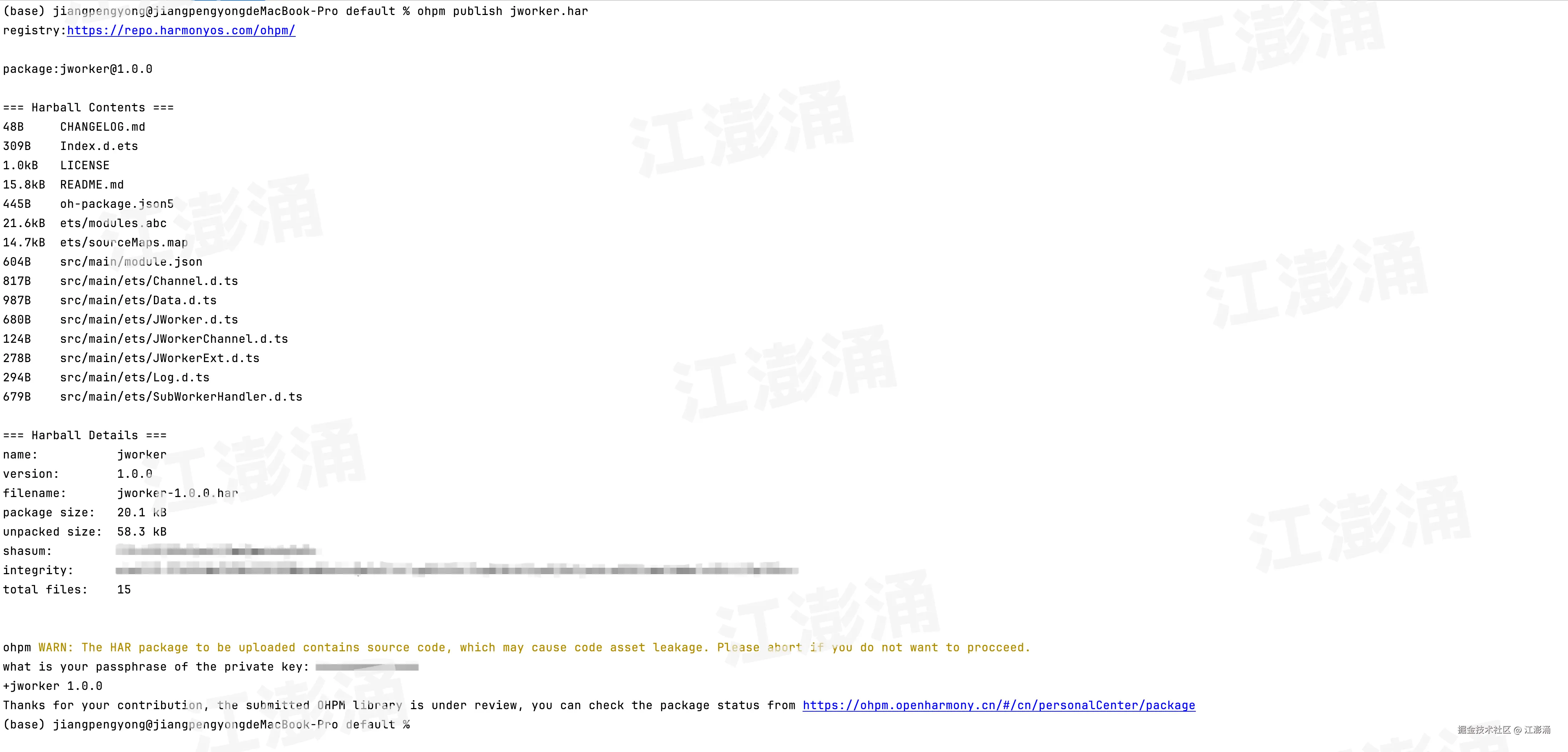 进入到上图所示的 default 目录下,然后运行 ohpm publish jworker.har 进行发布,过程需要输入密钥的密码,输入后就完成了。过程如下图所示: