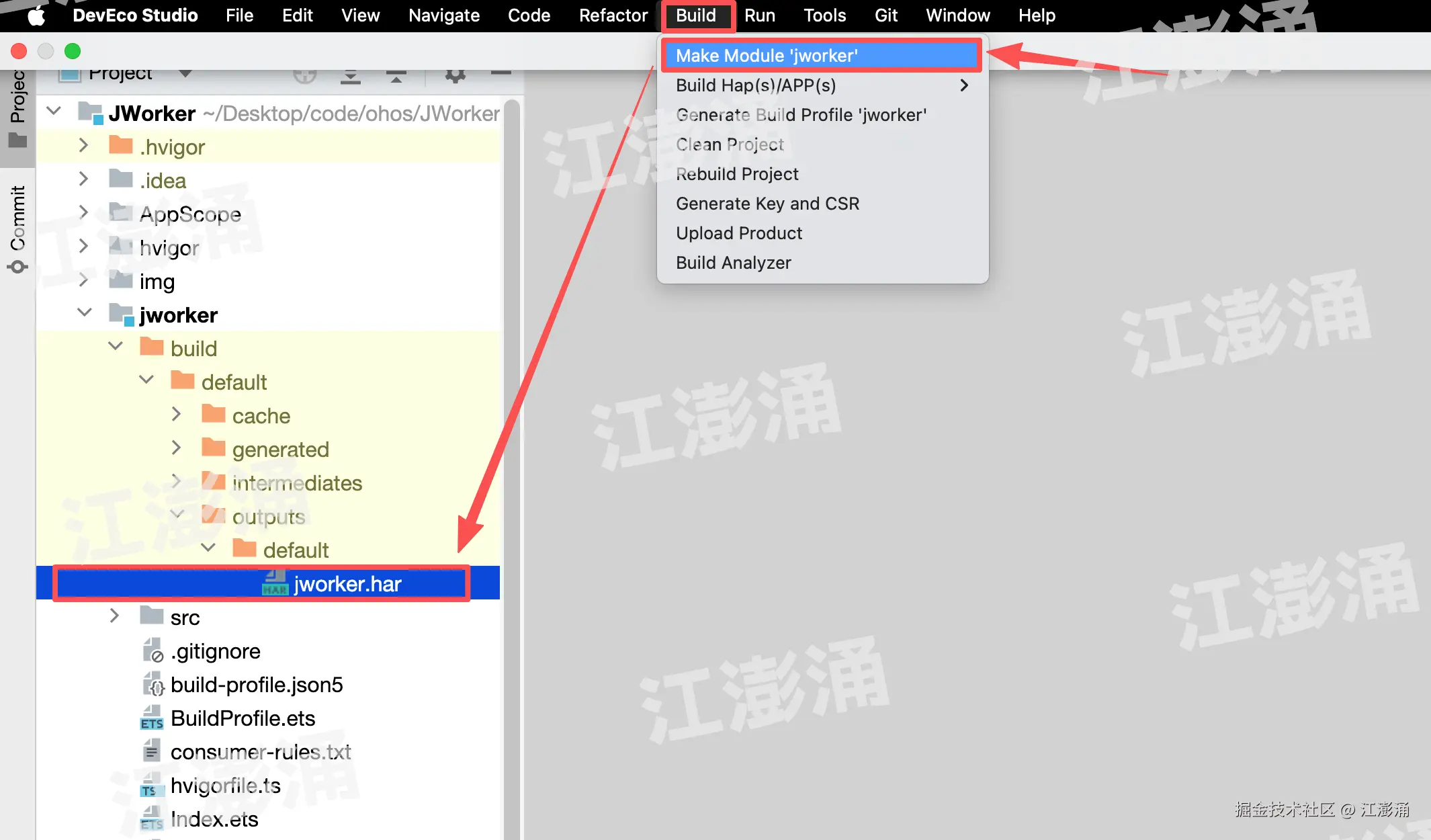 在鸿蒙的开发 ide 中,先进行 Build - Clean Project 打扫项目,然后 Build - Make Module '你的模块名' 进行 HAR 包编译,如下图所示