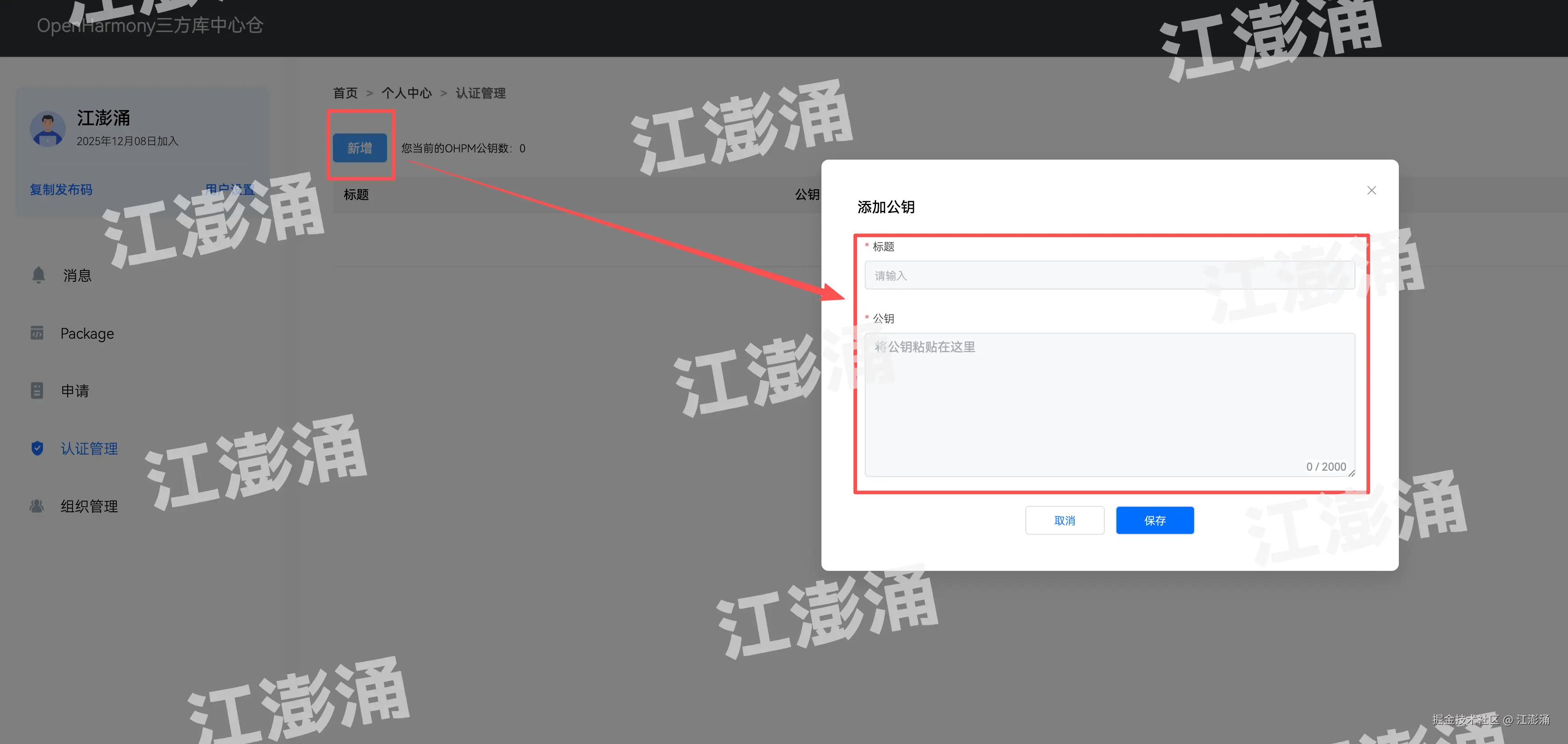 进入到 OpenHarmony 三方库中心仓的 "个人中心-认证管理",根据下图所示,在 "认证管理-新增" 的弹框中填入刚才生成的公钥 ohos_publish_key.pub 的内容然后保存。