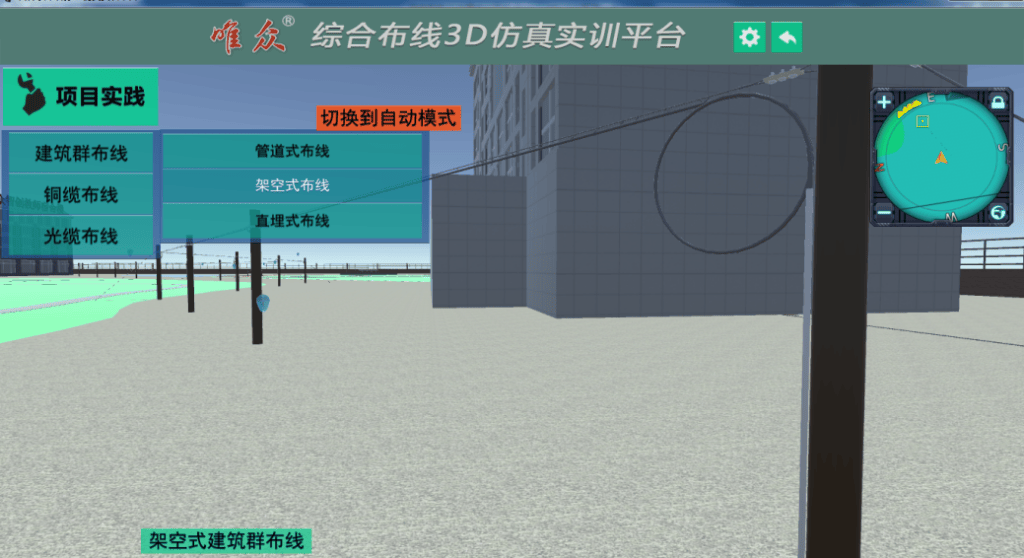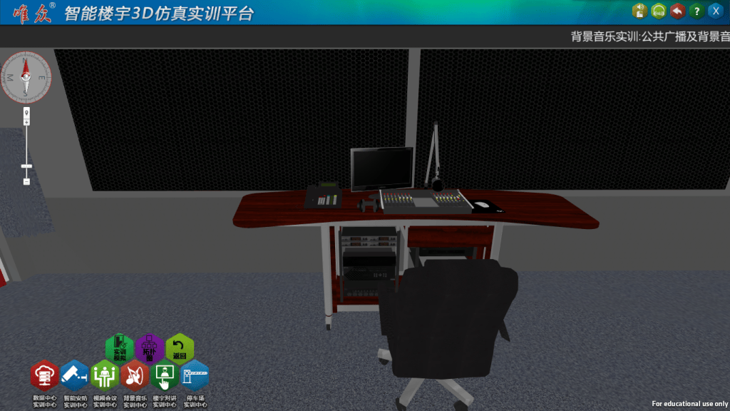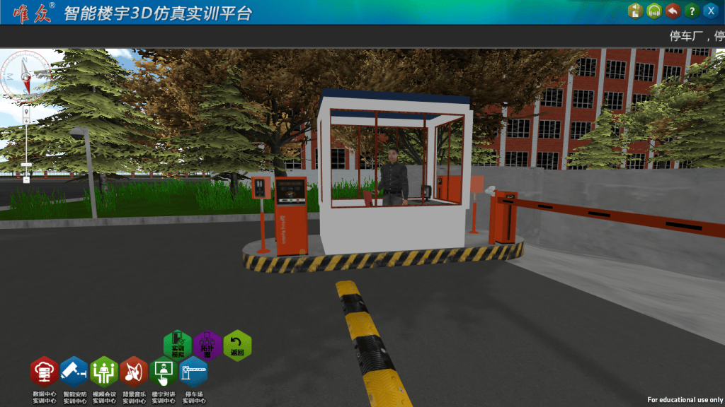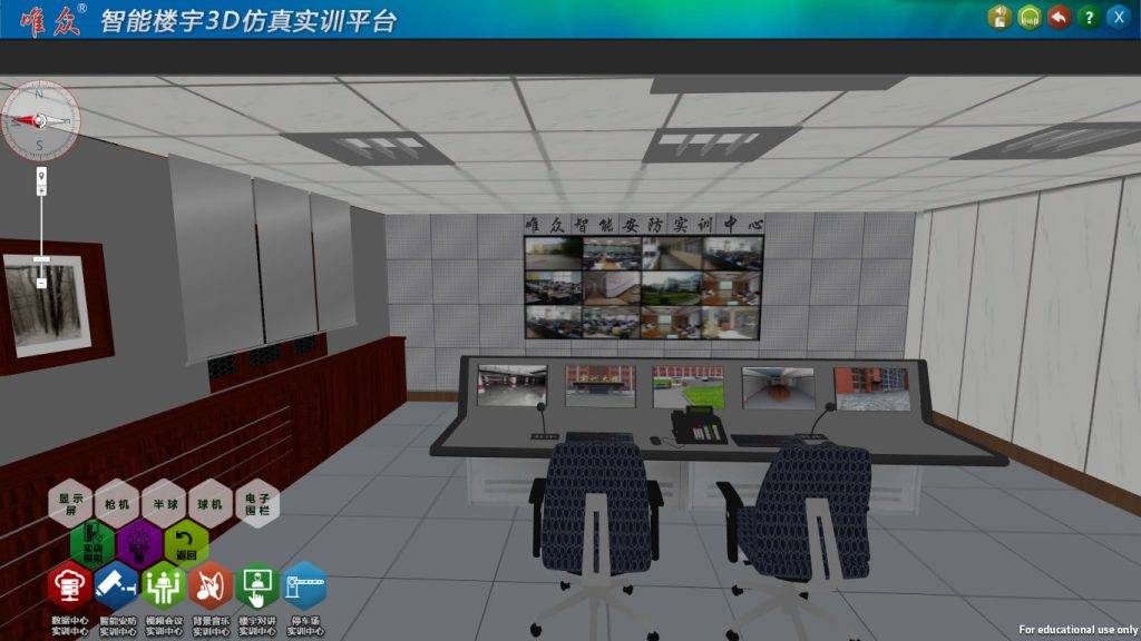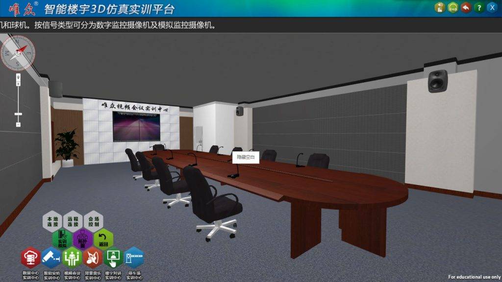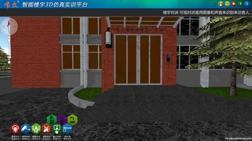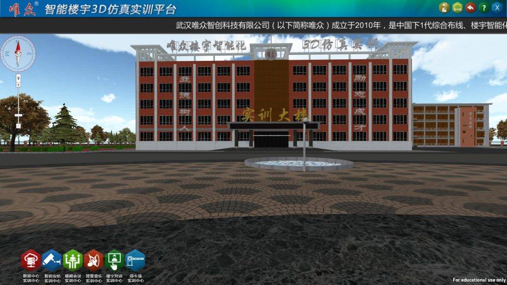 智能楼宇3D仿真实训平台,是建立在现实建筑智能化工程基础上,利用3D虚拟现实技术,依托于3D虚拟Unity平台通过模拟或还原现实中的建筑智能化工程,构建一个虚拟的3D立体工程场景。学生可以通过个性化的3D虚拟化身,在三维立体的虚拟环境中遍览智能化建筑的所有细节,形象逼真,细致生动。同时平台以"互联网+企业实践业务型"为思想,集"教、学、做"为一体的理念,以通用的、相对标准的现代化建筑智能化项目建设为核心,虚拟3D的工程场景,功能涵盖建筑智能化系统的安防监控、视频会议、背景音乐、楼宇对讲、停车场管理、机房工程等各个子系统。