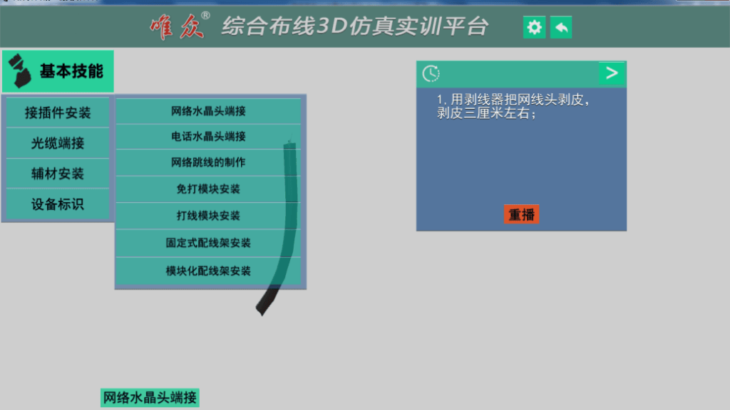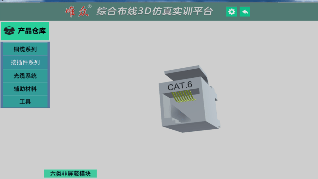 综合布线3D仿真实训平台针对综合布线工程"实操性强、耗材量大、工艺要求高"的特点,打造了从点位规划、线缆选型到端接测试的全流程虚拟实训场景。平台内置了国标布线规范数据库,学生在进行机柜端接、水平布线、垂直干线施工等操作时,系统会通过三维指引、实时纠错功能规范操作动作,避免传统实训中因操作不规范导致的材料浪费与安全隐患。同时,平台支持自定义场景搭建,学生可根据不同建筑结构设计布线方案,并通过虚拟测试仪验证方案的可行性,有效提升了从方案设计到落地实施的综合能力。