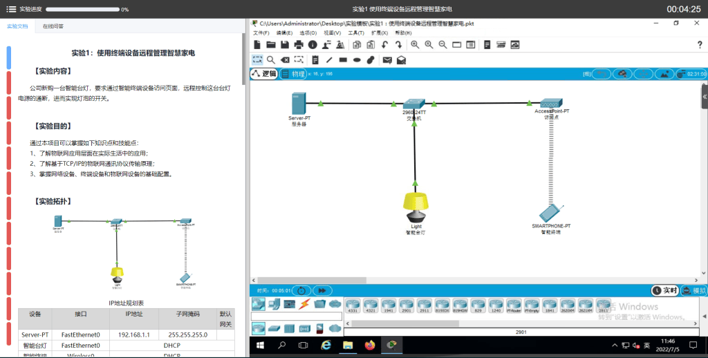 物联网仿真系统可以摆脱实际设备数量及实验室容量、课程时间安排等其他条件的限制,便于学生随时随地地进行实验,仿真环境中提供设备的多样性,这些设备包括常见的网关、执行器、传感器(温湿度、二氧化碳浓度、光照、空调、风机、运动检测器、声响检测器、气体检测器、风力检测器、光电探测器、金属传感器、RFID 以及电位器),系统还可以仿真UDP、TCP、HTTP、MQTT等联网通讯协议,非常方便创建智能家居、智能电网、智能交通、智能停车、智慧农业应用,并能对应用进行可视化管理。图形用户界面直接使用拖曳方法建立物联网拓扑结构, 并可以利用物联网设备进行配置和编程,还能实现了智能物联网在感知层、传输层 和应用层过程仿真。