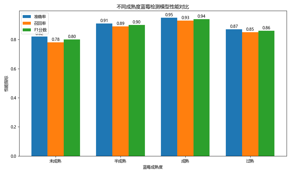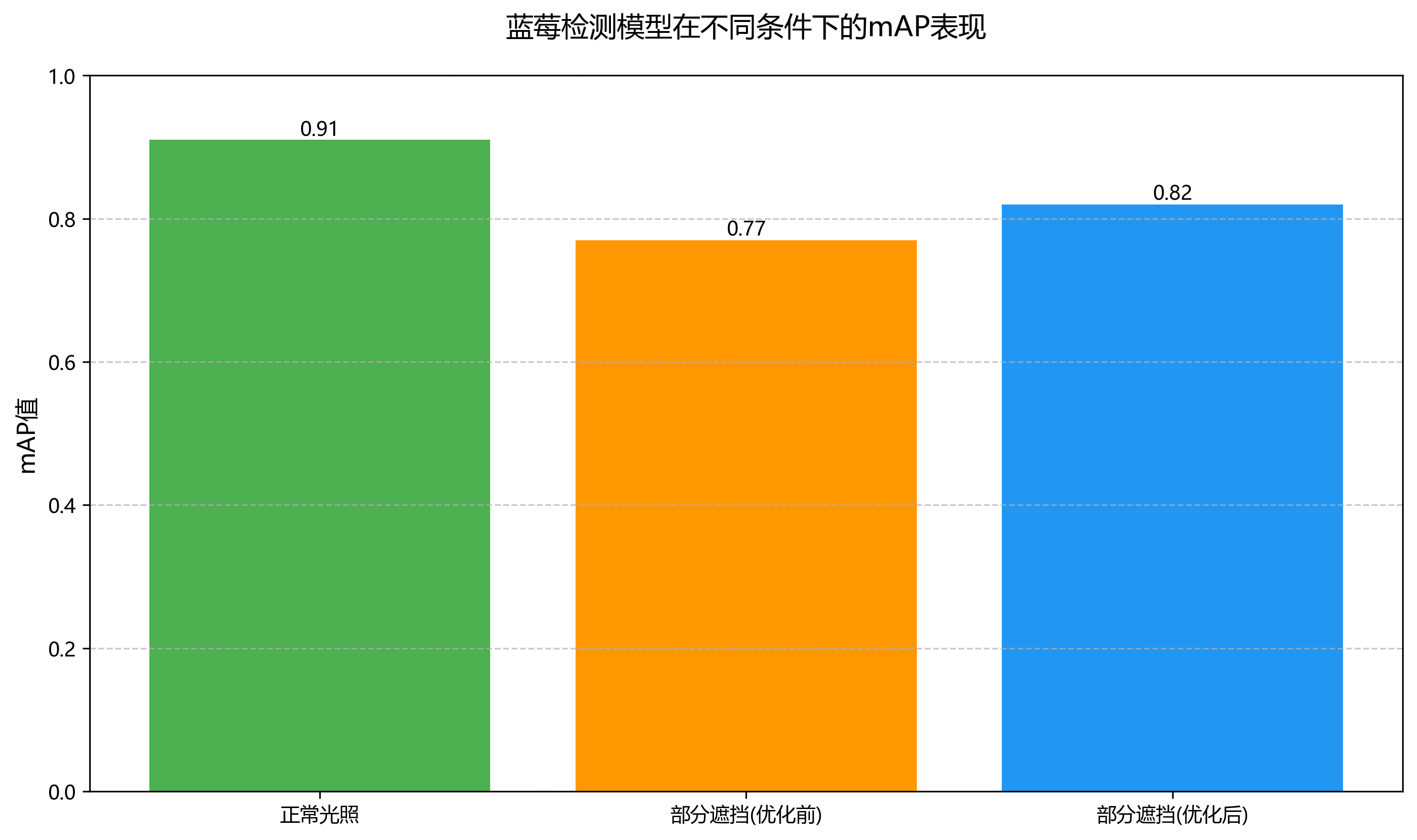评估指标中,mAP是最常用的目标检测指标,它计算了所有类别的平均精度。对于蓝莓果实检测,不仅要关注mAP,还要特别关注小果实的检测精度,因为小果实往往更难检测。在实际应用中,通常需要根据具体需求调整精确率和召回率的平衡,例如在自动化采摘系统中,可能需要更高的召回率以确保不漏检果实。