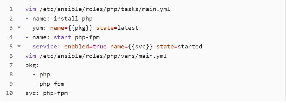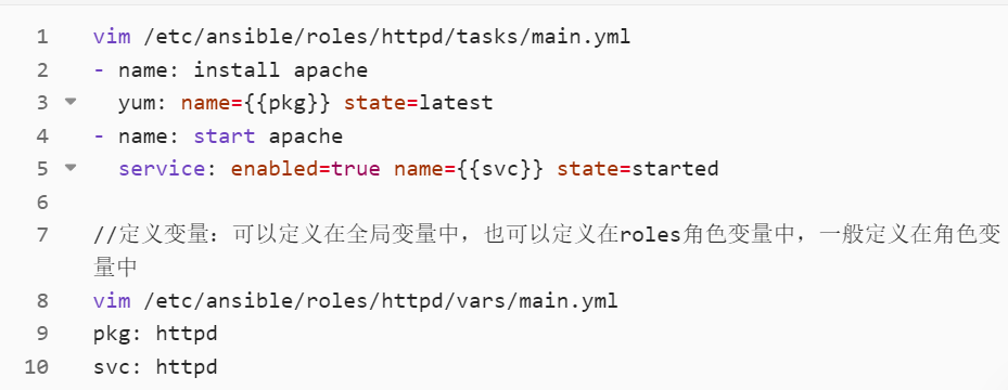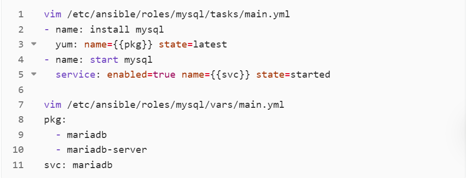 - vars: 此目录应当包含一个 main.yml 文件,用于定义此角色用到的变量。