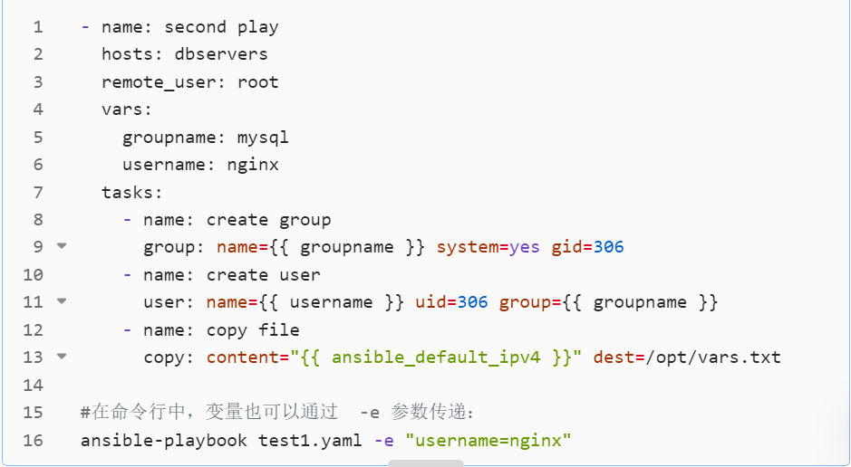 这是你之前用到的方式,在 Play 的vars里定义变量,整个 Play 的所有任务(包括template 任务)和 J2 模板都能读取,适合通用变量(如端口、域名、路径)