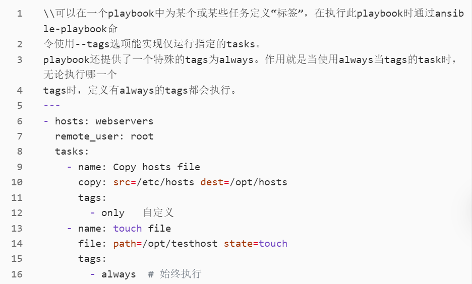 Tags 允许你指定只执行某些特定任务。通过命令行传入 --tags 参数来执行带有特定标签的任务。