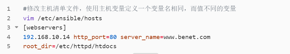 - 定义变量并在主机清单中指定: