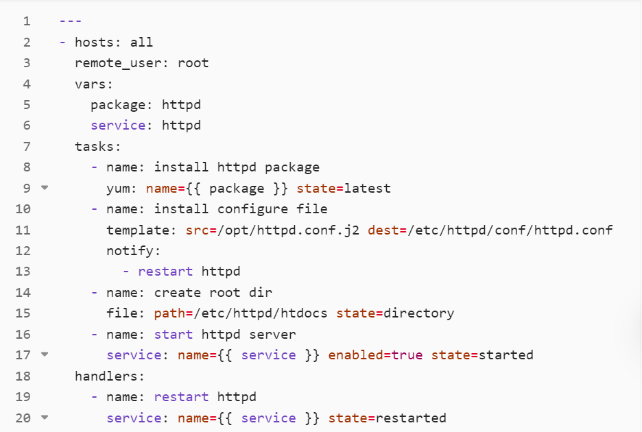 - handlers: 此目录应当包含一个 main.yml 文件,用于定义此角色中触发条件时执行的动作。