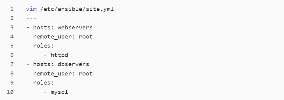 - 修改 site.yml 文件,针对不同主机去调用不同的角色: