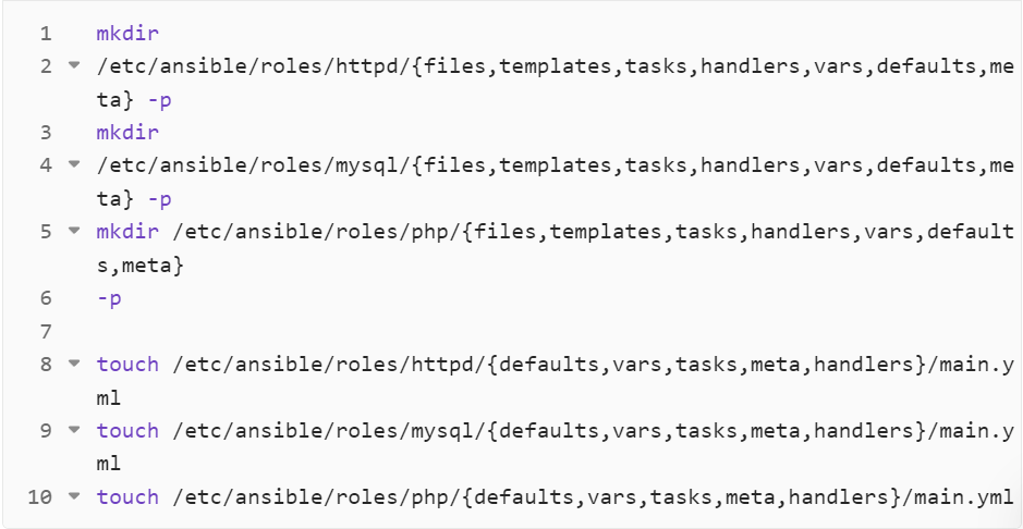 mkdir /etc/ansible/roles/httpd/{files,templates,tasks,handlers,vars,defaults,meta}