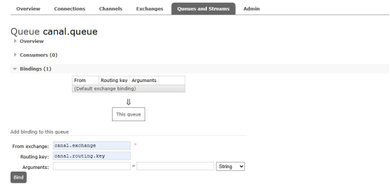 点击刚创建好的队列"canal.queue",进入页面后,绑定相应的交换机exchange和路由