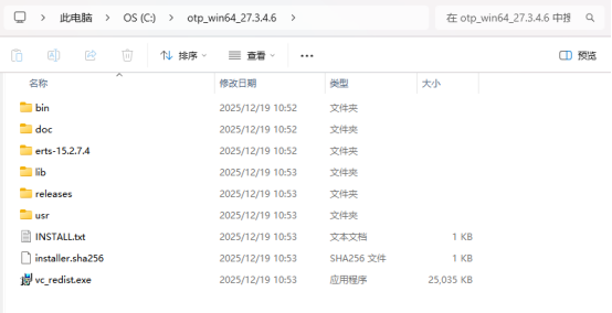 2、下载后,解压缩包,目录如下(目录路径:C:/otp_win64_27.3.4.6)