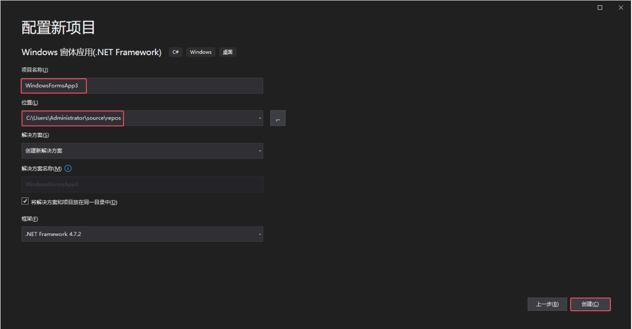 2.选择开发语言为"C#"和Windows窗体应用程序,点击下一步。